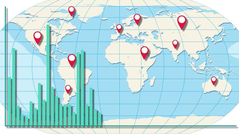 Animated world map with bar graphs illustrating economic data growth, featuring location markers and dynamic transitions Pro Video