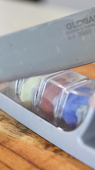 A knife is sharpened using a handheld sharpener on a wooden surface. Close-up shots highlight the sharpening process Pro Video