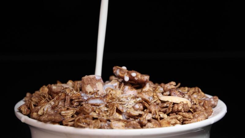 Milk streams into a bowl of crunchy cereal, creating a dynamic splash effect against a dark background Pro Video
