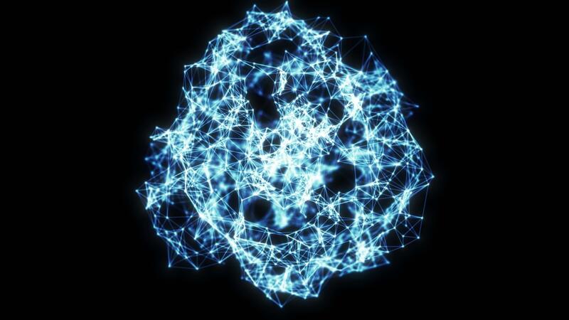 A futuristic 3D sphere made up of glowing blue connected nodes and lines and a plexus rotating in space. Ideal for visualizing networks, data, AI or blockchain technologies. Pro Video