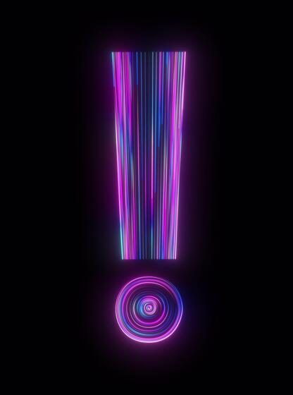 Exclamation mark appears in bright purple and cyan neon light with animated glow effect on transparent background with alpha channel part of a cohesive neon styled collection including numbers Pro Video