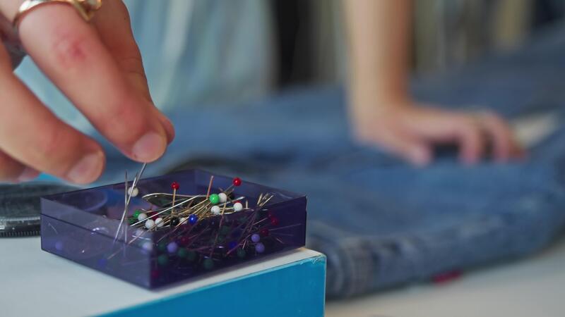 Tailor carefully picks one pin from a pile lying in a box and uses it to pin clothes while working in his workshop or atelier. Close up. Pro Video