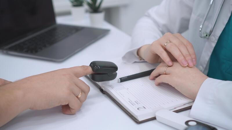 Close up of doctor monitoring patients vital signs using digital pulse oximeter device during medical consultation in modern healthcare setting with laptop and notebook for digital documentation Pro Video