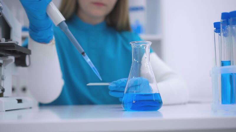 Laboratory Experiment with Pipette and Flask. Female Scientist Conducting Experiment in Modern Laboratory Pro Video