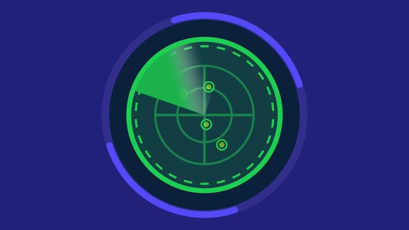 A rotating radar animation showing scanning movements in green on a dark blue background, simulating detection and tracking radar systems Free Video