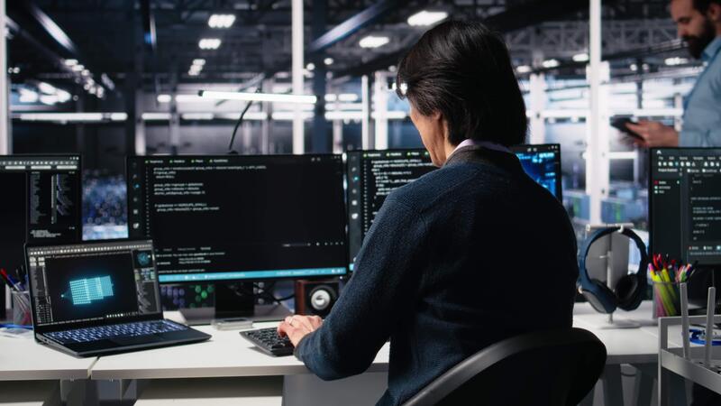 Admin in high tech data center coding with machine learning assistant. Worker using artificial intelligence neural networks large language model technology, camera A Pro Video