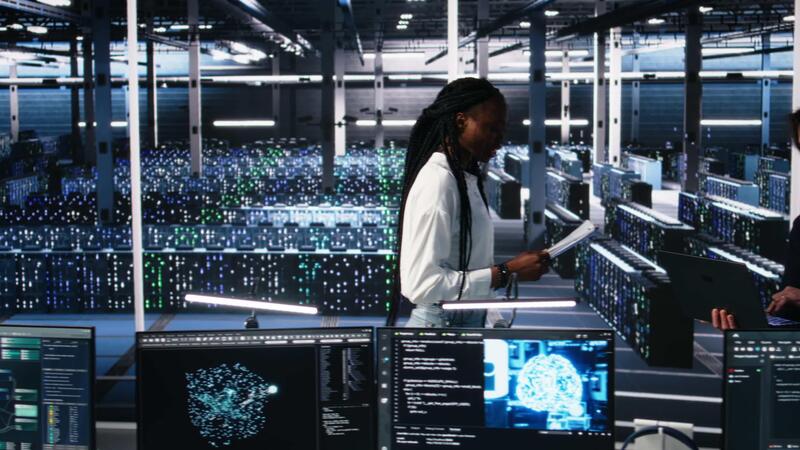 Data center engineers managing AI systems for uptime and efficiency, looking over paperwork files. African american woman and Asian man reading documents in multiethnic server hub, camera A Pro Video