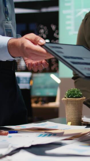 Vertical Business colleagues attending in a late night briefing session for teamwork, exchanging documents and reviewing finance updates. Aligning objectives through problem solving. Camera A. Pro Video