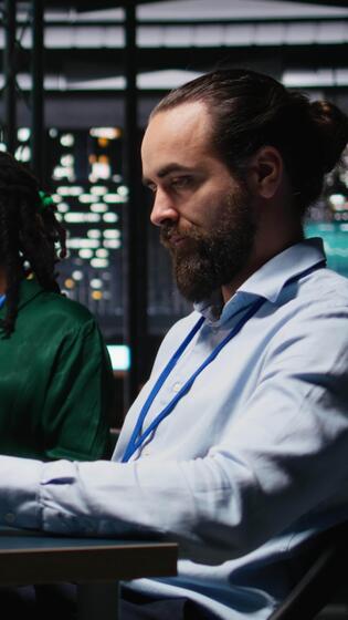 Vertical Diverse team of analysts reviewing annual data reports in after hours meeting, developing internal communication to ensure productivity. Working on enterprise development plans. Camera A. Pro Video