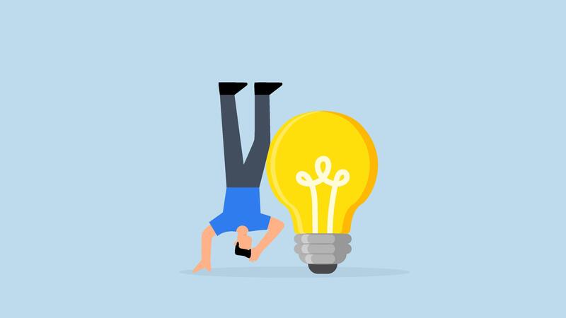 Think different to create unique idea, 4k animation of entrepreneur who contemplates concept with light bulb in different location. Pro Video