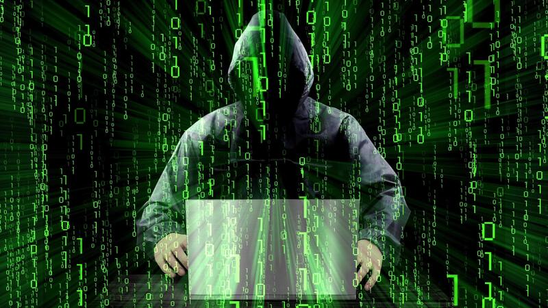 Hooded Hacker Working on Computer, Binary Code in Background Pro Video