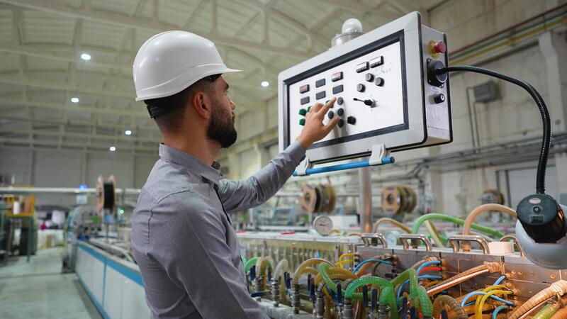 Industrial engineer working at programmable CNC machine in window factory Pro Video