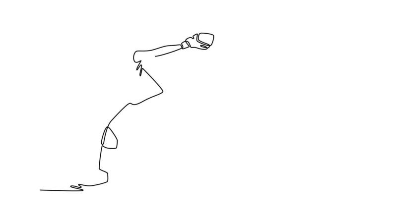 Self drawing animation of single line draw attractive baseball player throws the ball on stadium. Female pitcher in competitive game on sport field for training. Continuous line. Full length animated Pro Video