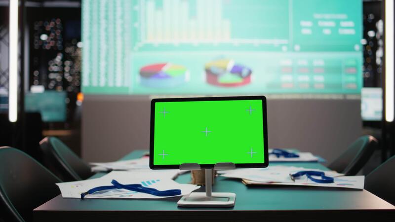 Boardroom table with a tablet running isolated mockup under night lights, performance projections and analysis charts glow from digital projectors. Showcasing modern business strategy. Pro Video