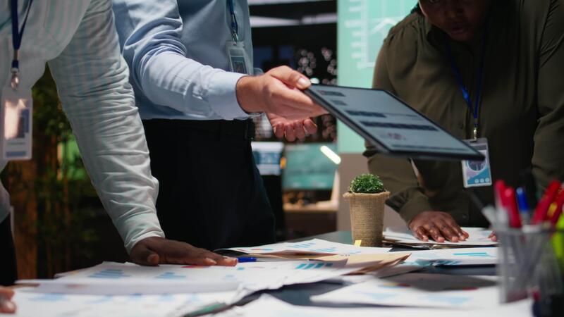 Business colleagues attending in a late night briefing session for teamwork, exchanging documents and reviewing finance updates. Aligning objectives through problem solving. Camera A. Pro Video