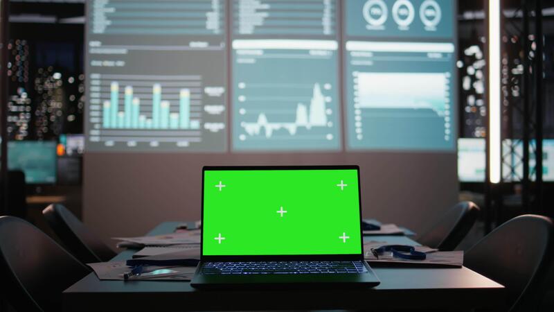 After hours office space with mockup laptop and a glowing analytics display, multinational company space. Highlighting business management and administration in a quiet high tech environment. Pro Video