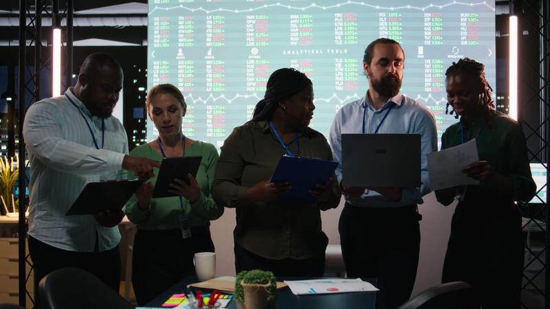 Portrait of diverse business colleagues reviewing monthly insights and performance indicators within the company. Employees conducting evaluations and sharing ideas for goal setting. Camera A. Pro Video