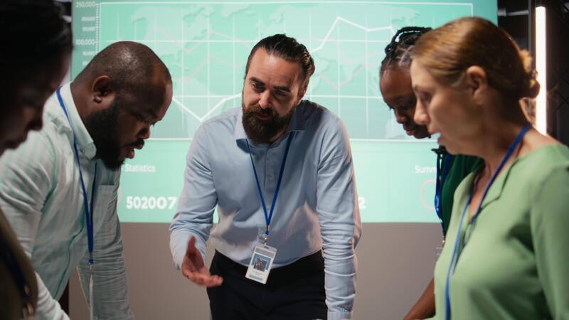 Diverse group of professionals review files and performance metrics, using projections and budgeting to align the company goals with stakeholder expectations for company progress. Camera A. Pro Video