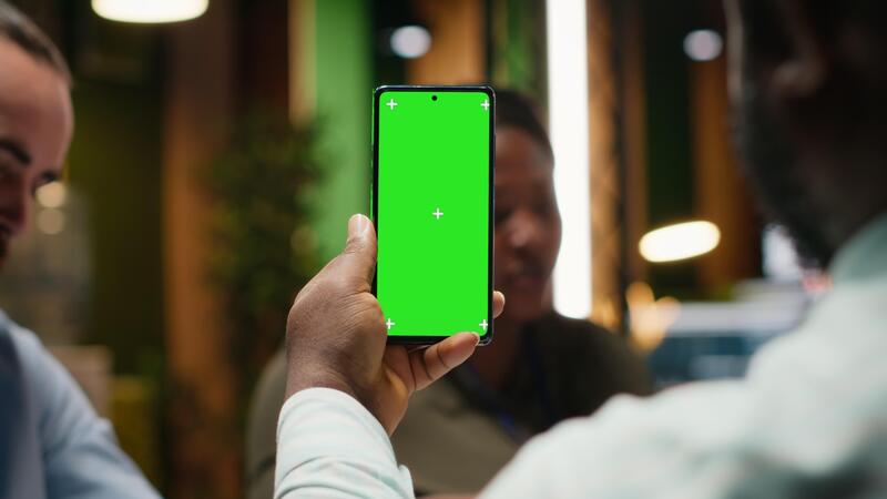 Diverse business team hosting a meeting with chroma key on device, late night briefing conference to discuss budget updates and performance metrics. Align company objectives for vision. Camera B. Pro Video