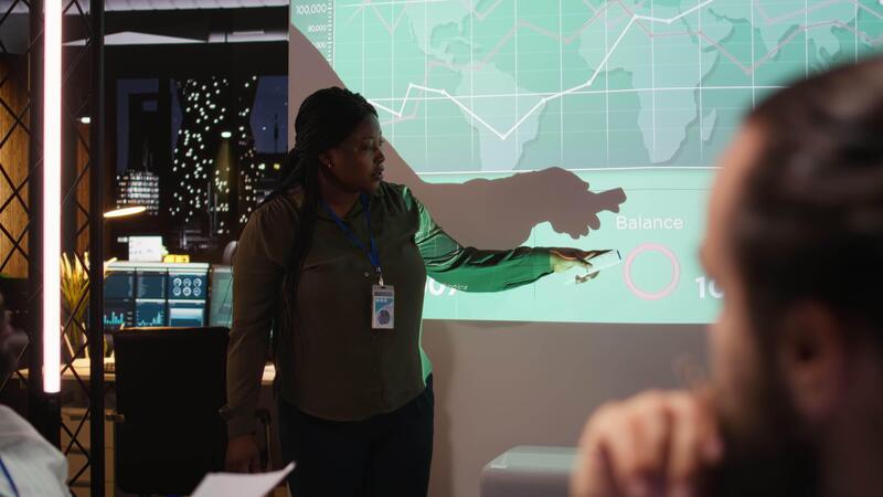 Diverse group of corporate associates look into project timelines and agenda, create a strategy for development after hours in conference room. Goal setting in business environment. Camera A. Pro Video