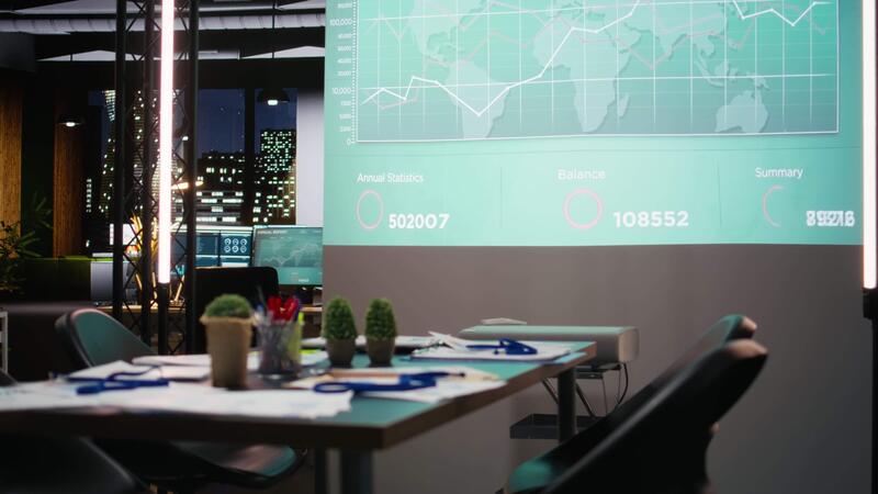 Modern corporate space sits empty after hours with forecasting charts and business analytics displayed across the wall. Capturing the late night management and planning event. Project insight. Pro Video