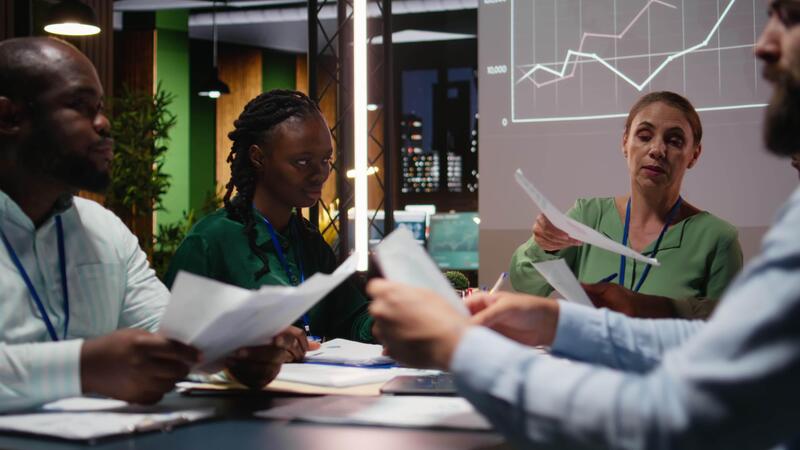Diverse project team shares analytics reports during advisory board event after hours, reviewing business intel and preparing insight for upcoming presentation with advisors. Camera A. Pro Video