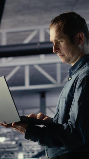Vertical Data center technician investigates neural networks configuration, making adjustments to ensure optimal function. Server room employee checks machine learning error reports, camera B Pro Video