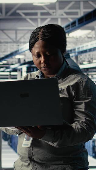 Vertical Data center technician deploys machine learning software on infrastructure racks. African american woman in server farm trains AI systems with datasets using laptop to support applications, camera A Pro Video