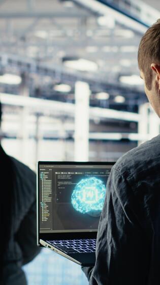 Vertical Data center system administrators investigate neural networks configuration, adjusting for optimal function. Server hub employees use laptop to check deep learning error reports, camera B Pro Video