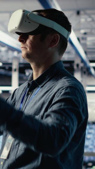 Vertical Data center system administrator uses virtual reality tech, improving AI rigs processing speed. Man in server farm wearing VR goggles to provide support for artificial intelligence workloads, camera B Pro Video