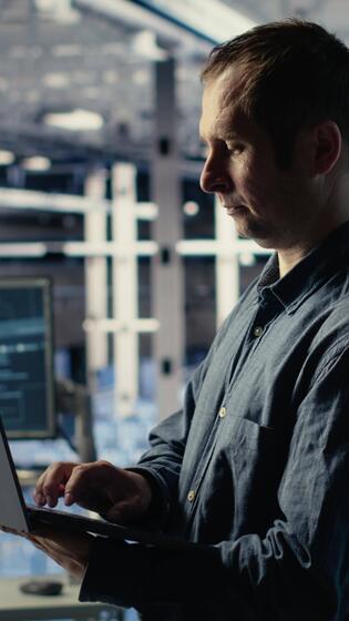 Vertical Engineer in data center checks AI dashboard using laptop during routine systems review. IT expert tests artificial intelligence tools on notebook to confirm reliable performance, camera B Pro Video