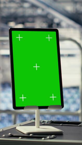 Vertical Close up of mockup device in data center with advanced technology supercomputers gear. Green screen tablet in server room with high tech systems detecting data patterns, panning shot Pro Video