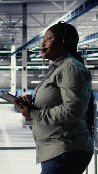 Vertical Server room tech support specialist guides clients through setting up secure company data backups. System administrator in data center helps users fix system errors on servers, camera A Pro Video