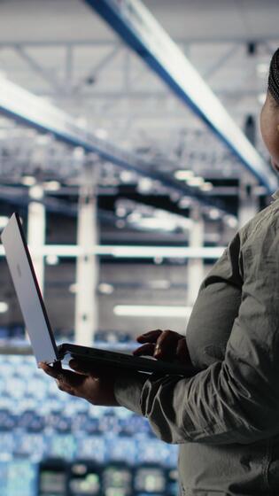 Vertical Data center admin investigates AI configurations using laptop, making adjustments to ensure optimal function. African american woman in server hub checks deep learning errors reports, camera B Pro Video