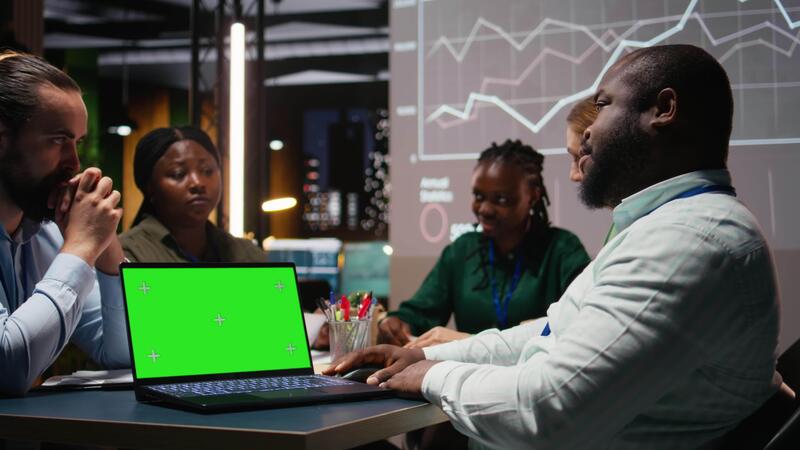 Diverse business team hosting a meeting with chroma key on device, late night briefing conference to discuss budget updates and performance metrics. Align company objectives for vision. Camera A. Pro Video