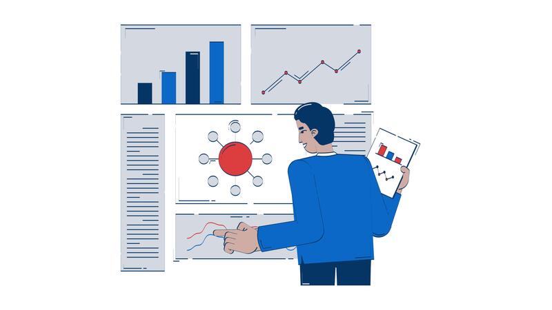 Comparing results and data evaluation doodle animation. Business dashboard. Analytical decision-making. Indian analyst animated 2D flat cartoon concept, white background. 4K motion graphic Pro Video
