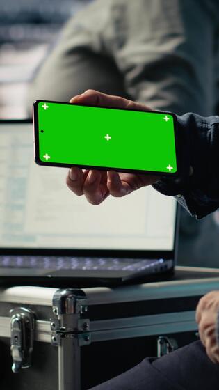 Vertical Data center worker uses isolated screen smartphone while deploying deep learning software. Server hub employee uses chroma key mobile phone while training AI systems with datasets, camera B Pro Video