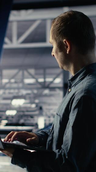 Vertical Data center admin on industrial platform checks AI dashboard using laptop. Man in server farm tests artificial intelligence tools on notebook to ensure reliable performance, camera B Pro Video