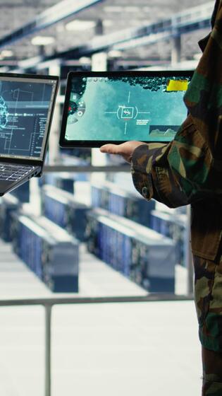 Vertical Close up of army general and coworker in data center integrating AI into radar systems for missile tracking. Teamworking soldier and technician in server hub analyzing aerial movement on device, camera A Pro Video
