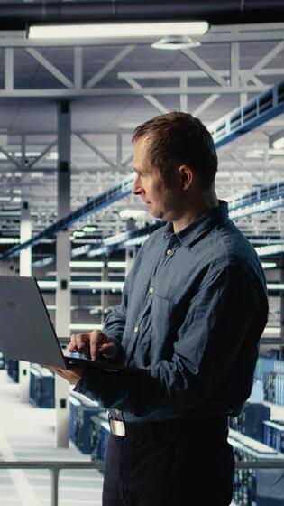 Vertical Data center engineer monitors machine learning process with laptop, reviewing operational metrics. IT specialist reviews neural networks reports during inspection to verify ongoing stability, camera A Pro Video