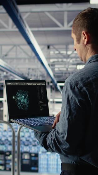 Vertical Data center admin using AI LLM chatbot suggestions to improve rigs processing speed and efficiency. Server hub worker using large language model to support artificial intelligence workloads, camera A Pro Video