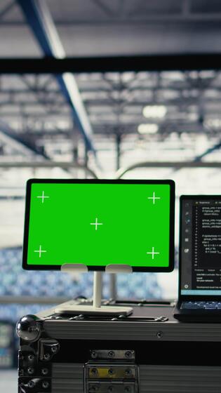 Vertical Green screen tablet in high tech data center with machines verifying blockchain transactions. Chroma key device in industrial server farm with hardware processing tokens exchanges Pro Video