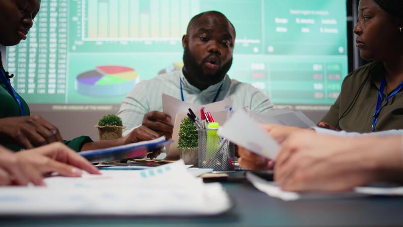 Multiethnic team reviewing infographics to offer solutions to fix project issues, working after hours to finish tasks before deadline. Analysts attending problem solving meeting. Camera A. Pro Video