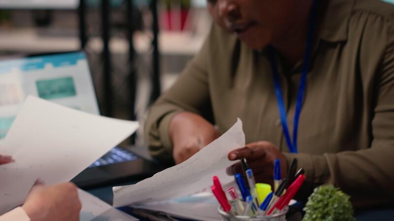 Professional group of female associates analyzing project documents fueled by collaboration and determination, aligning corporate goals to build a unified vision. Networking. Camera B. Pro Video