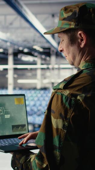 Vertical Military technician in data center tracking satellite coordinates using notebook software interface. Army unit in server hub analyzing reconnaissance data through satellite imaging systems, camera A Pro Video