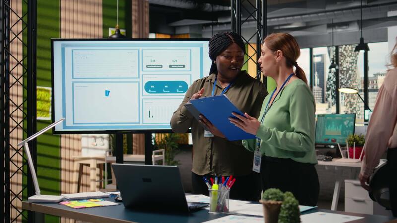 Collaborative team of professional women reviews key data and reports while setting strategy for business growth, aligning insights with development goals and teamwork. Networking. Camera A. Pro Video