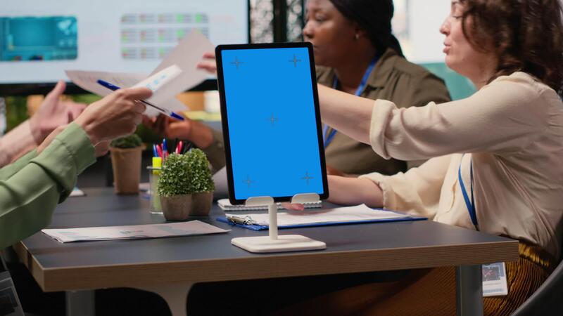 Businesswomen use a copy space display and charts to pitch career vision, transforming isolated space into interactive charts, goals and insights as part of strategic work environment. Camera B. Pro Video