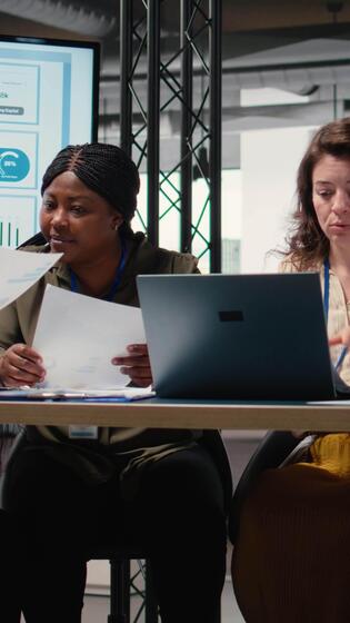 Vertical Group of businesswomen engaging in collaboration during briefing session, analyzing data and writing reports while embracing a mindset of growth. Goals oriented meeting. Camera A. Pro Video