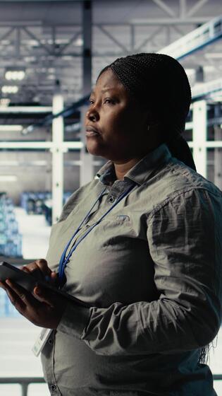 Vertical Software developers monitor server hub activity using tablet. Data center employees doing brainstorming, reviewing equipment tests results on devices to ensure systems are working correctly, camera A Pro Video
