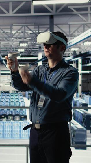 Vertical Data center system administrator uses virtual reality tech, improving AI rigs processing speed. Man in server farm wearing VR goggles to provide support for artificial intelligence workloads, camera A Pro Video